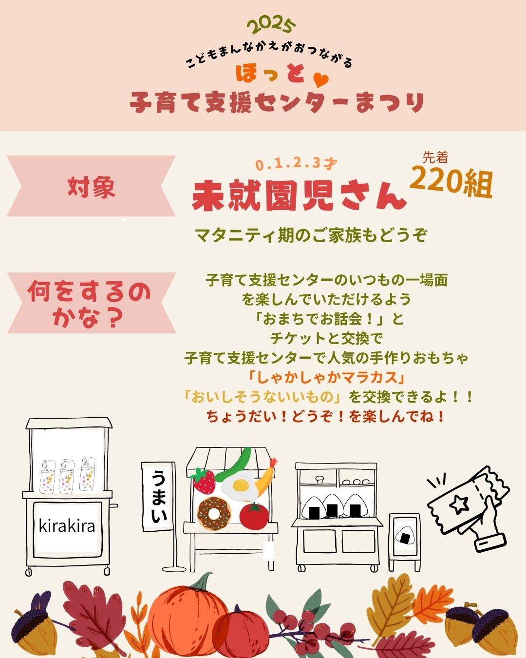 今年のおまつりのテーマは、「こどもまんなか 笑顔つながる!子育て支援センターまつり2025」 子育て支援センターのいつもの一場面を「おまちでいつものお話会」を楽しみましょう!中央子育て支援センターのせんせいたちのステージ!城東子育て支援センターのせんせいたちのステージ!いつものおたのしみが青空の下で楽しめます!!みんなの笑顔をみーんなで想って、スタッフも、地域のボランティアさんもたのしく準備をしています。 ぜひ、まだ子育て支援センターにきたことがないお友達もさそってきてくださいね!